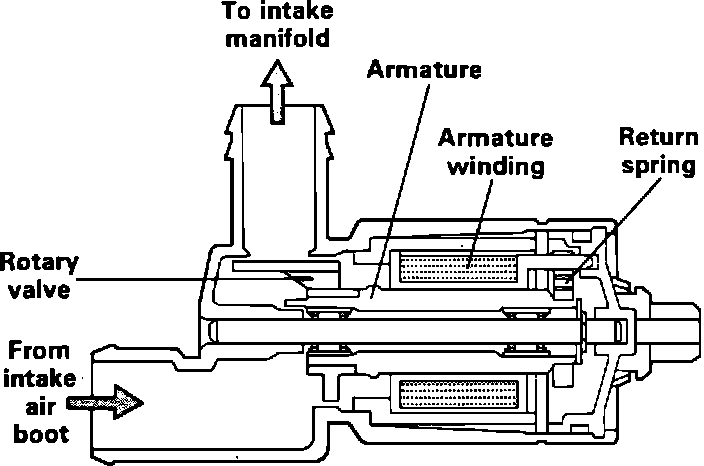 The idle stabilizer is a single winding rotary type valve. It consists of a small single winding electric motor, a rotary valve and return spring attached to the motor's armature.