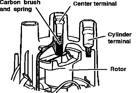 High tension current enters the cap through the center terminal, flows through the spring loaded carbon brush to the rotor. From the rotor it is distributed to the four cylinder towers in a pre-set sequence and then to the spark plug wires which carry the current on to the spark plugs.