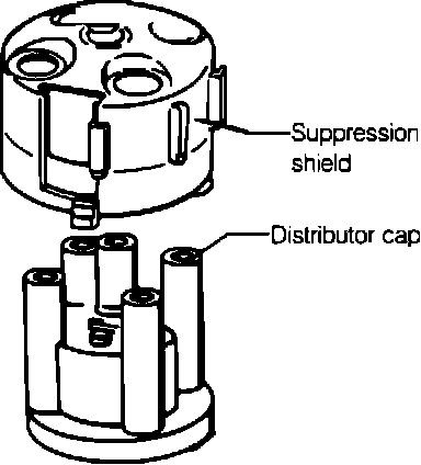 The distributor cap, clipped to the top of the distributor, is used to make the connection between the coil wire and the correct spark plug wire. The static shield provides radio static suppression so the high energy sparking that occurs inside the cap does not interfere with radio transmission/reception. The shield is grounded via the distributor cap clips.