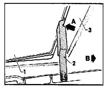 - Pull headliner and tilting frame 1 down until special tool 2 engages headliner trim frame 3 (arrow A).