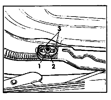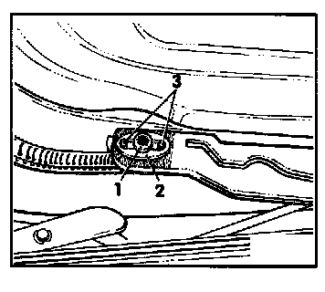 - Remove mounting screw 1 (Torx) and adjusting washers 2 from locating pins 3.