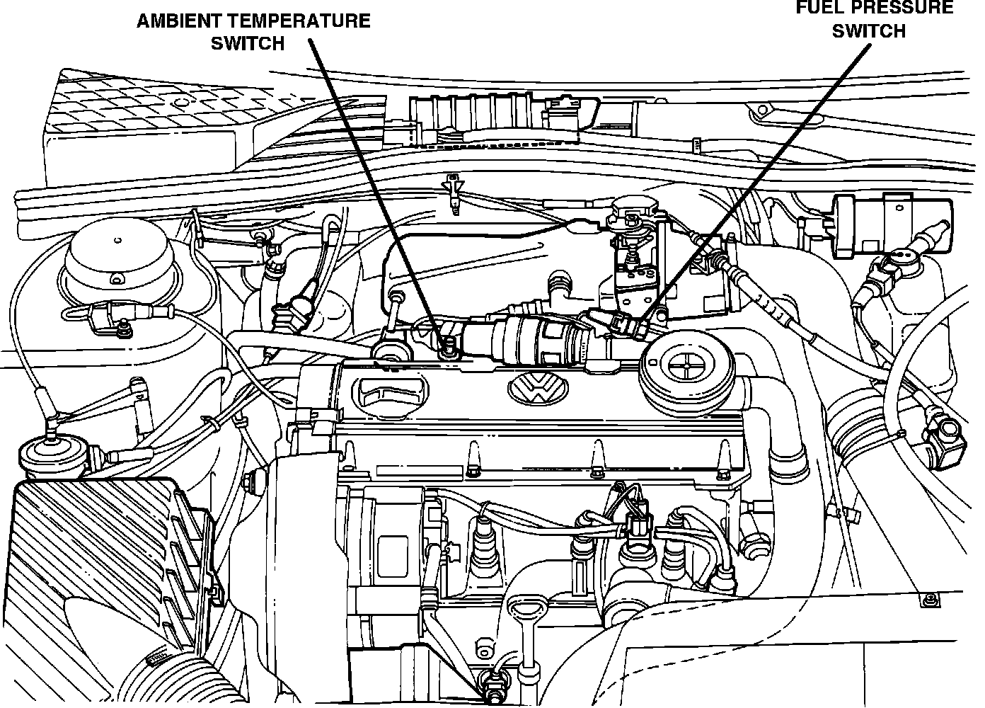 The Fuel Pressure Switch is located on the left side of the intake manifold in front of the throttle body. A fuel line from the fuel rail is attached to the switch. The fuel pressure switch provides the fuel pump after-run control unit with fuel pressure information.