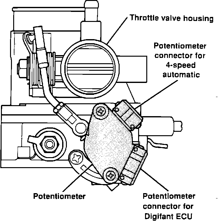 NOTE: If the the throttle valve potentiometer is misadjusted, the engine may surge at idle or cutout during a steady driving speed or light throttle applications.The throttle valve basic adjustment must be OK for this adjustment to be valid. Refer to FUEL SYSTEMS.