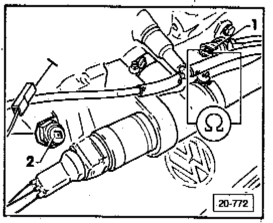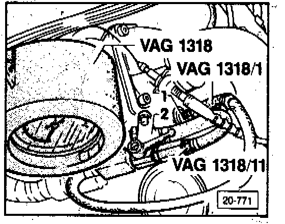 - connect pressure tester VAG 1318 using adaptors 1318/1 and 1318/11 between fuel distributor 1 and pressure switch 2