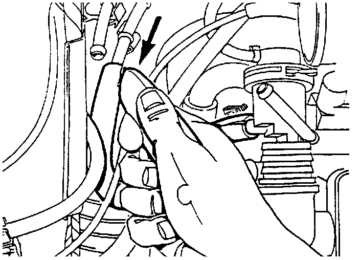 - Use specially designed cutting knife, pant number KL 2298, and carefully slice both ends of fuel feed hose open (see arrow) to prepare hose for easy removal.