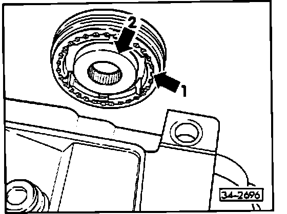 ^ install so that teeth (arrow 1) in synchronizer, and high collar of synchronizer hub (arrow 2) face transmission housing