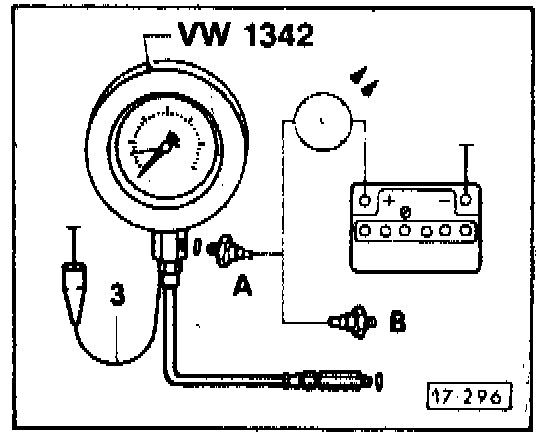 - connect LED test lamp VAG 1527a (US 1115) with lead from VW 1594 to 0.3 bar( 4.4 psi) oil pressure switch A (F22-brown insulation)