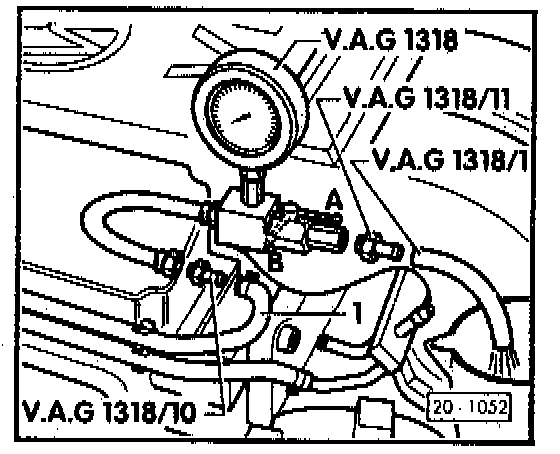 - connect VAG 1318 pressure tester to the fuel supply line 1 with adaptor VAG 1318/1A