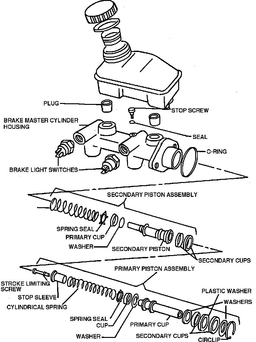 2. Siphon brake fluid from reservoir, then disconnect brake lines from master cylinder and electrical connectors from brake light switches.