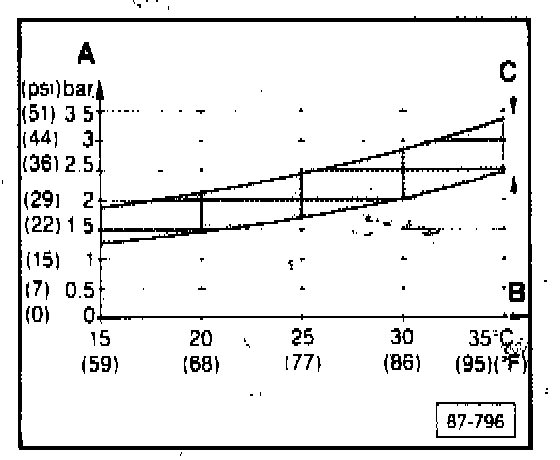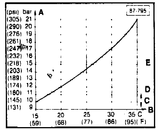 When outside air temperature is 86°F, A/C system high side pressure should be approximately 247 psi. Radiator cooling fan on high speed.