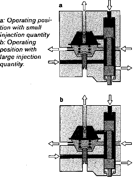 If a large basic injection quantity flows into the upper chamber, the diaphragm bends downwards and opens the outlet of the metering valve until the set differential pressure is reached again. If the flow quantity drops, the metering valve opening is reduced due to the equilibrium of forces at the diaphragm until a pressure differential of 0.2 bar is again reached. This means that an equilibrium of forces exists at the diaphragm which can be maintained for every basic injection quantity by controlling the metering valve opening size.