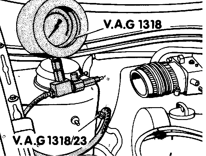 - Connect pressure gauge VAG 1318 to fuel supply line using adaptor VAG 1318/23