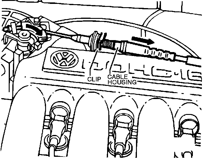 1. Remove the retaining clip and grommet at the intake manifold cover to slacken cable.