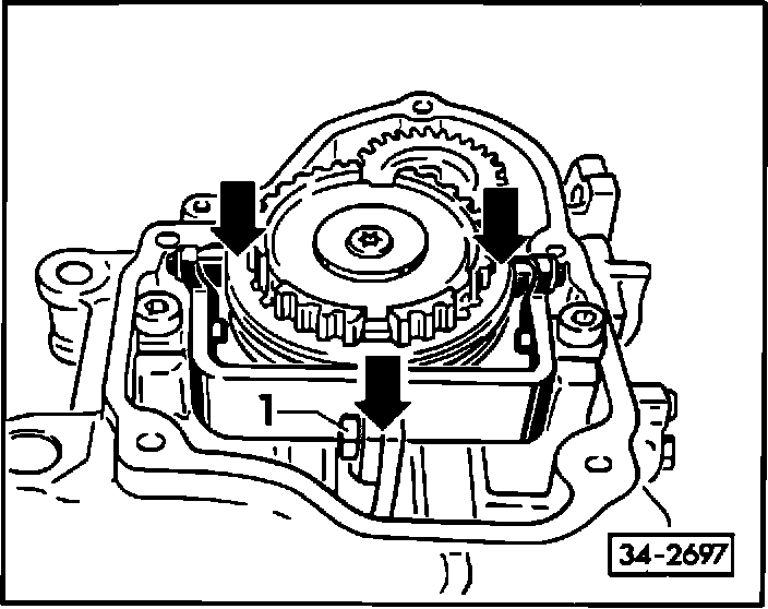 - engage 5th gear. Loosen bolt -1-. Push synchro sleeve and shift fork in direction of arrow and tighten bolt -1-