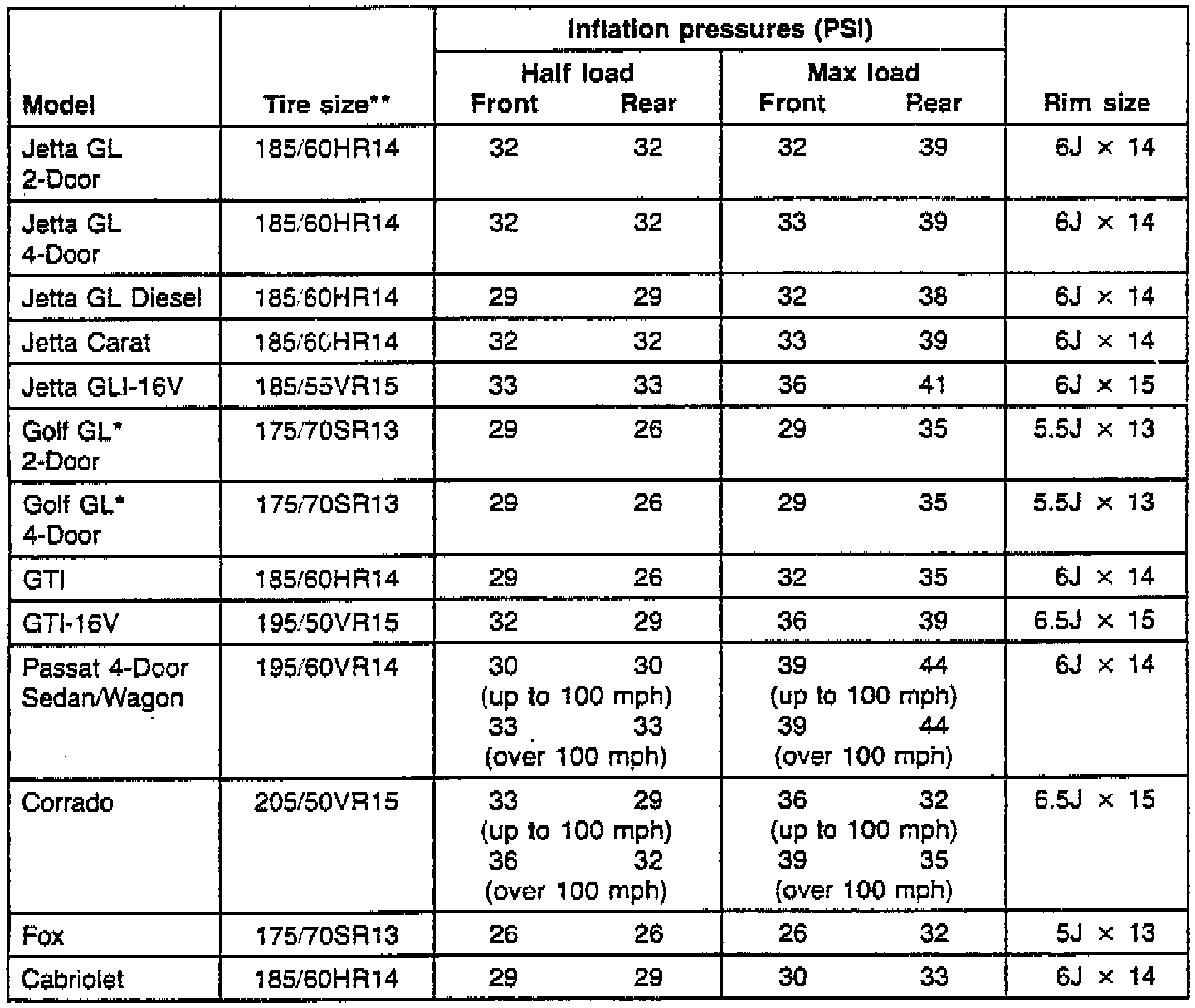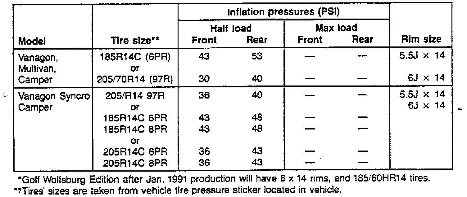 Tires - Recommended Sizes/Inflation Pressures