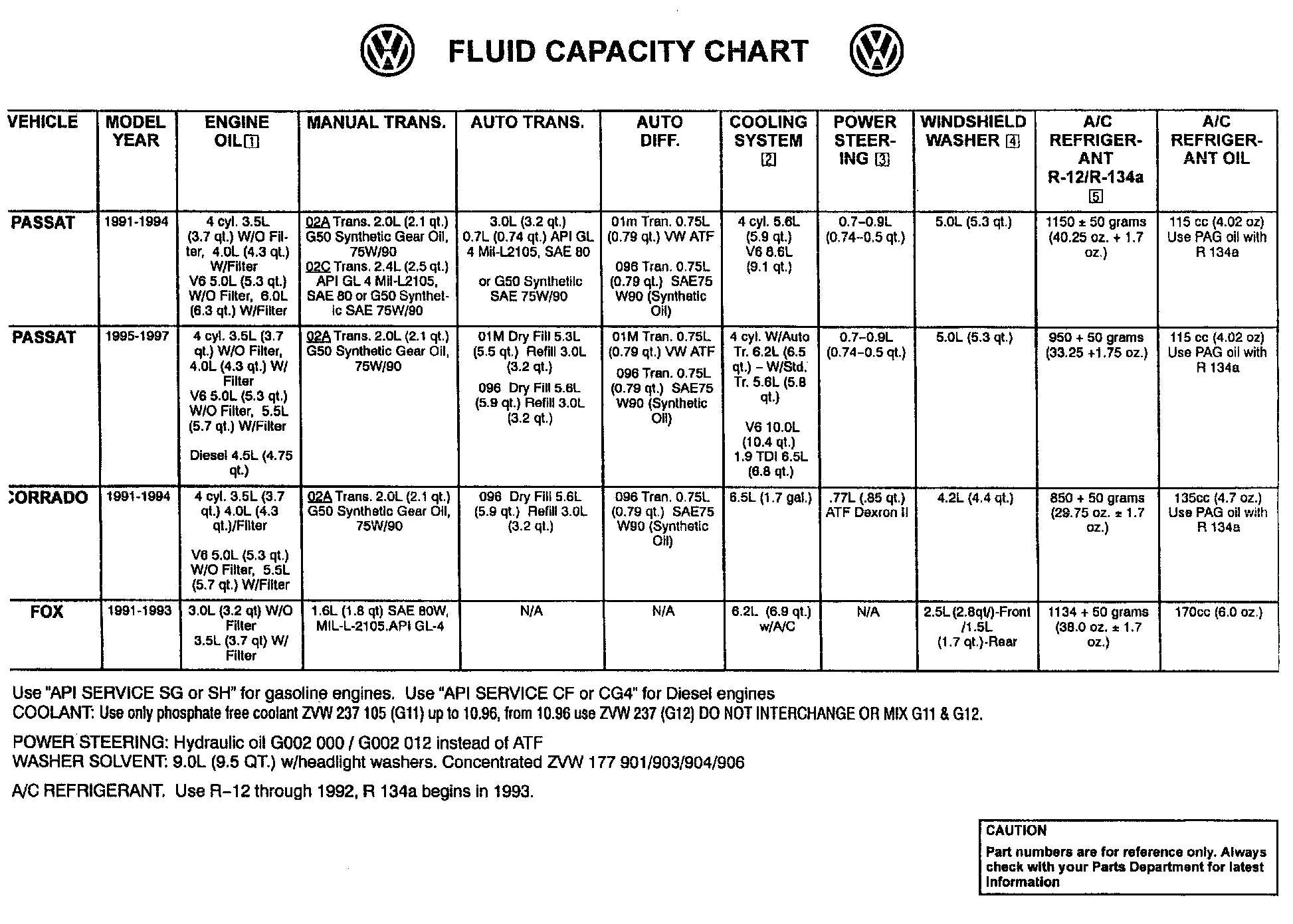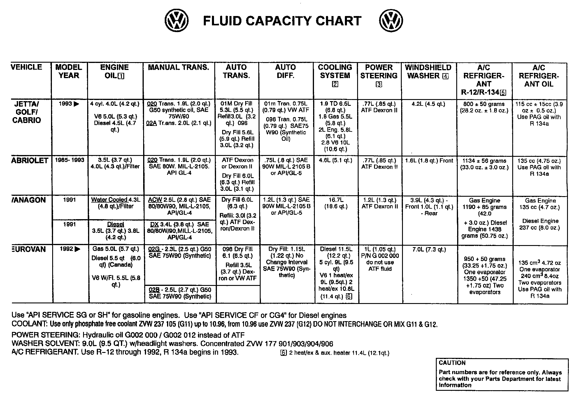 The fluid capacity chart covers all vehicles from 1991. Retain the previous fluid chart as a supplement for older vehicles.