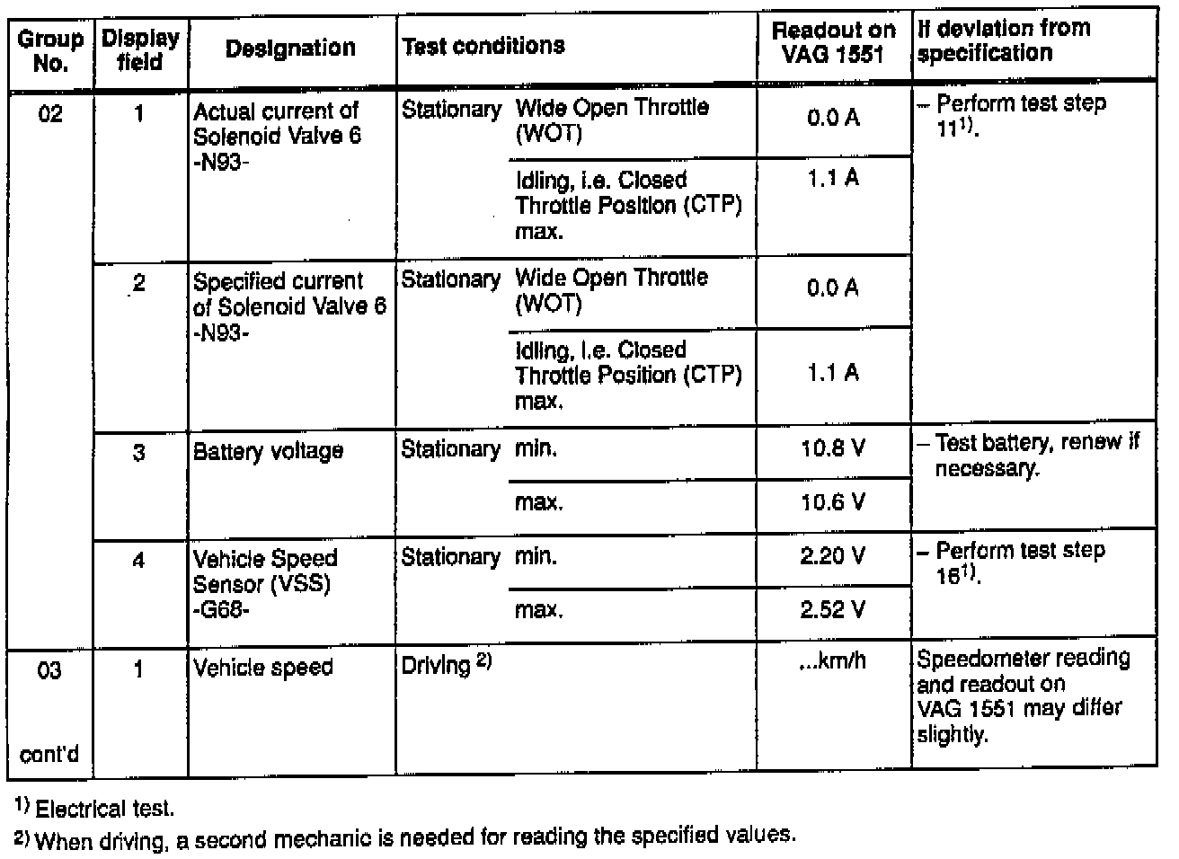 OBD Measured Output Value Specification Table: