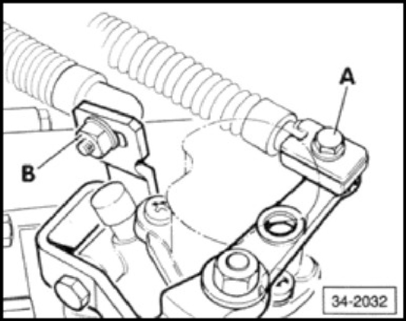 Loosen bolt A and nut B until operating cables move freely in centering holes