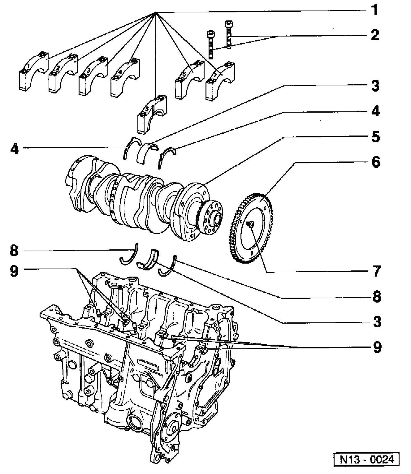 - Bearing shell retaining lugs for cylinder block and bearing caps must be on same side
