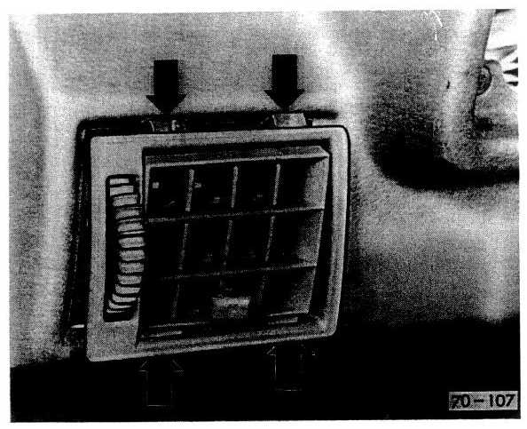 3. Remove the two instrument panel air vents. Use a screwdriver to press in the retaining springs shown in Fig. 2, and pry the vent out.