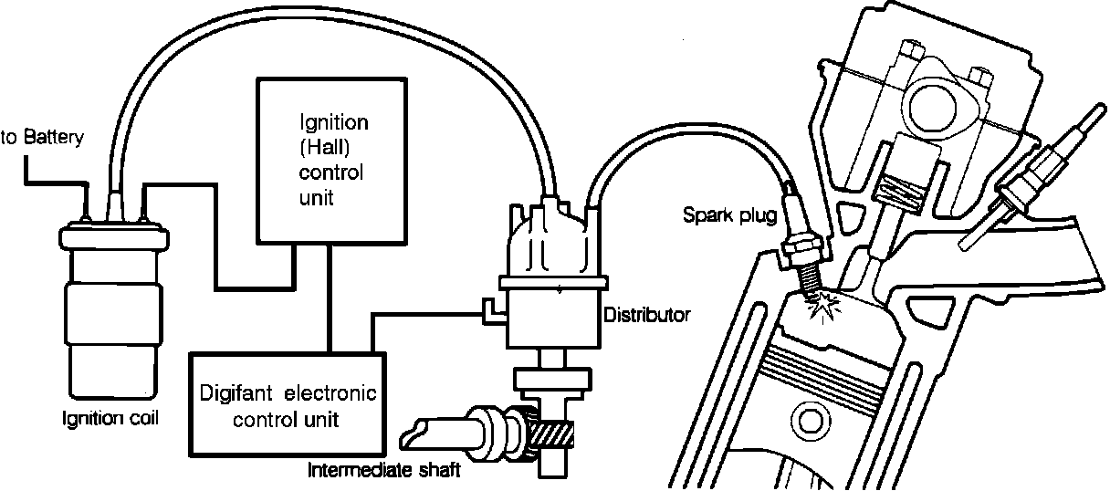 As the distributor shaft turns, the Shutter wheel (mounted to the shaft) induces a signal in the Hall-effect sender. The signal is sent to the Digifant II electronic control unit which uses various input devices to calculate the precise ignition timing signal. The timing signal is sent to the ignition (Hall) control unit which switches the coil primary circuit. This releases a precisely timed high voltage pulse, that flows through the coil wire to the distributor. The distributor rotor directs the voltage pulse, via the distributor cap, to the correct spark plug wire. At the spark plug it jumps a gap to reach engine ground. When the voltage pulse jumps the gap to ground, it creates a spark (ignition spark) strong enough to ignite the air/fuel mixture in the combustion chamber.