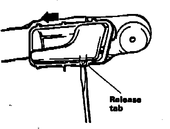 - Remove inside door release lower housing by pulling release tab on bottom rear of housing towards you and sliding housing forwards.