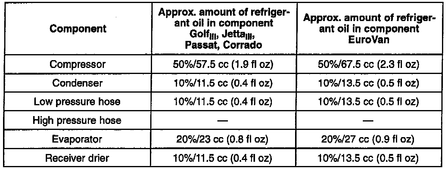 Replacement A/C compressors are filled with the total refrigerant oil (PAG oil) quantity needed for the entire refrigerant system (except for EuroVan models with two evaporators).