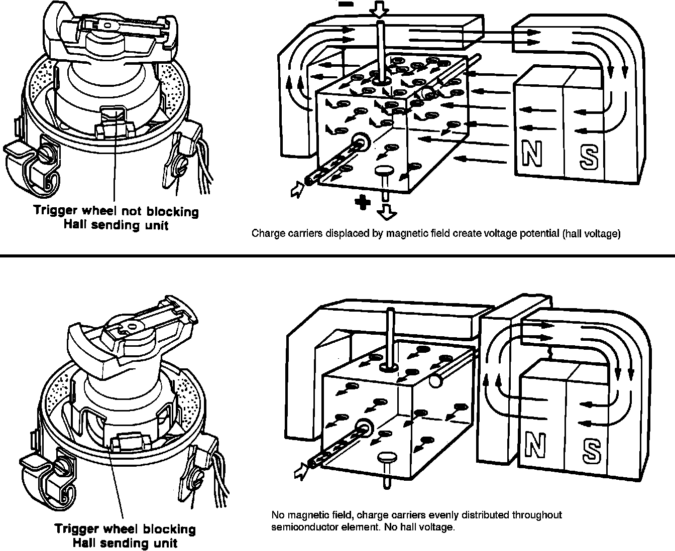 It consists of a semiconductor wafer element, and a permanent magnet. A rotating shutter called the trigger wheel acts as a switching device to produce an "ON", "OFF", signal for ignition control.