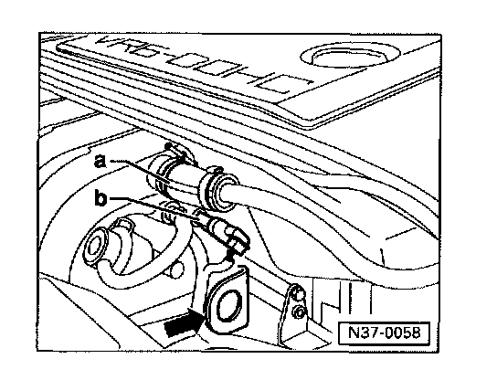- Remove vacuum line -a- and connector -b- before installing support bar into eye (arrow) on vehicles with 6-cylinder engines.