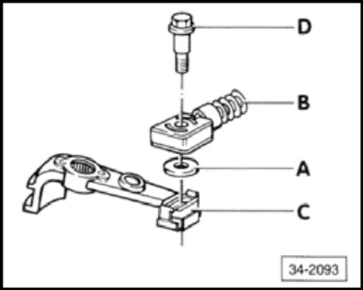 Transmission gearshift cable to gearshift lever, installingPlace washer A between shift cable B and shift lever C, and position with bolt D
