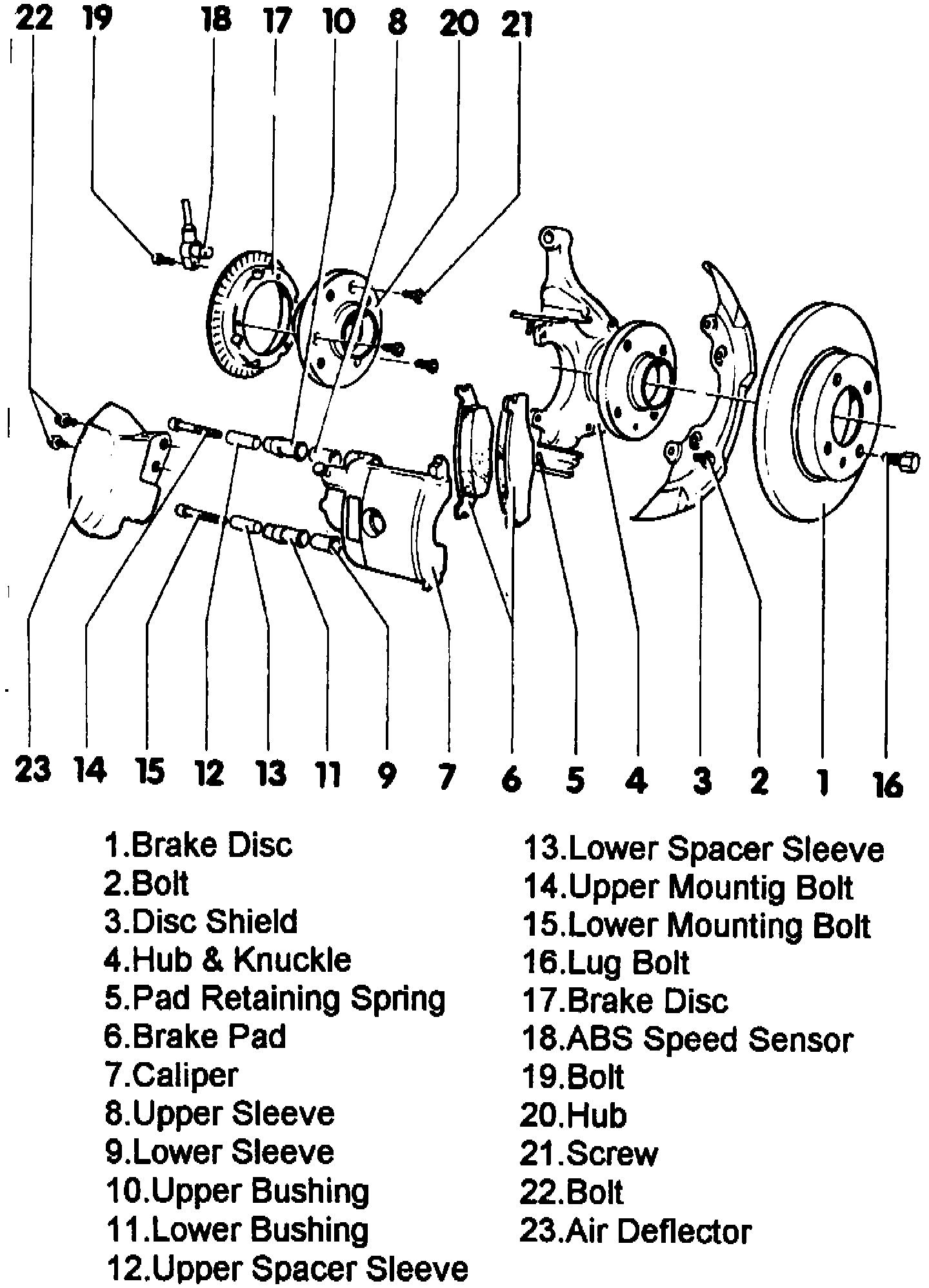 Always remove some brake fluid from master cylinder reservoir prior to installing new pads. When caliper piston is pushed back, fluid is forced out of caliper and into reservoir. After pads are installed and seated, refill reservoir to MAX mark.