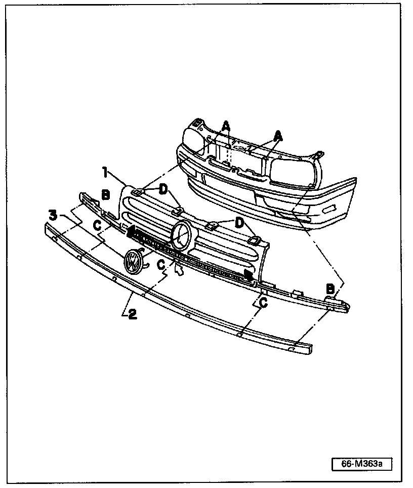 - Insert small tool into holes -A-, press on catches -D- and remove, remove radiator grille.