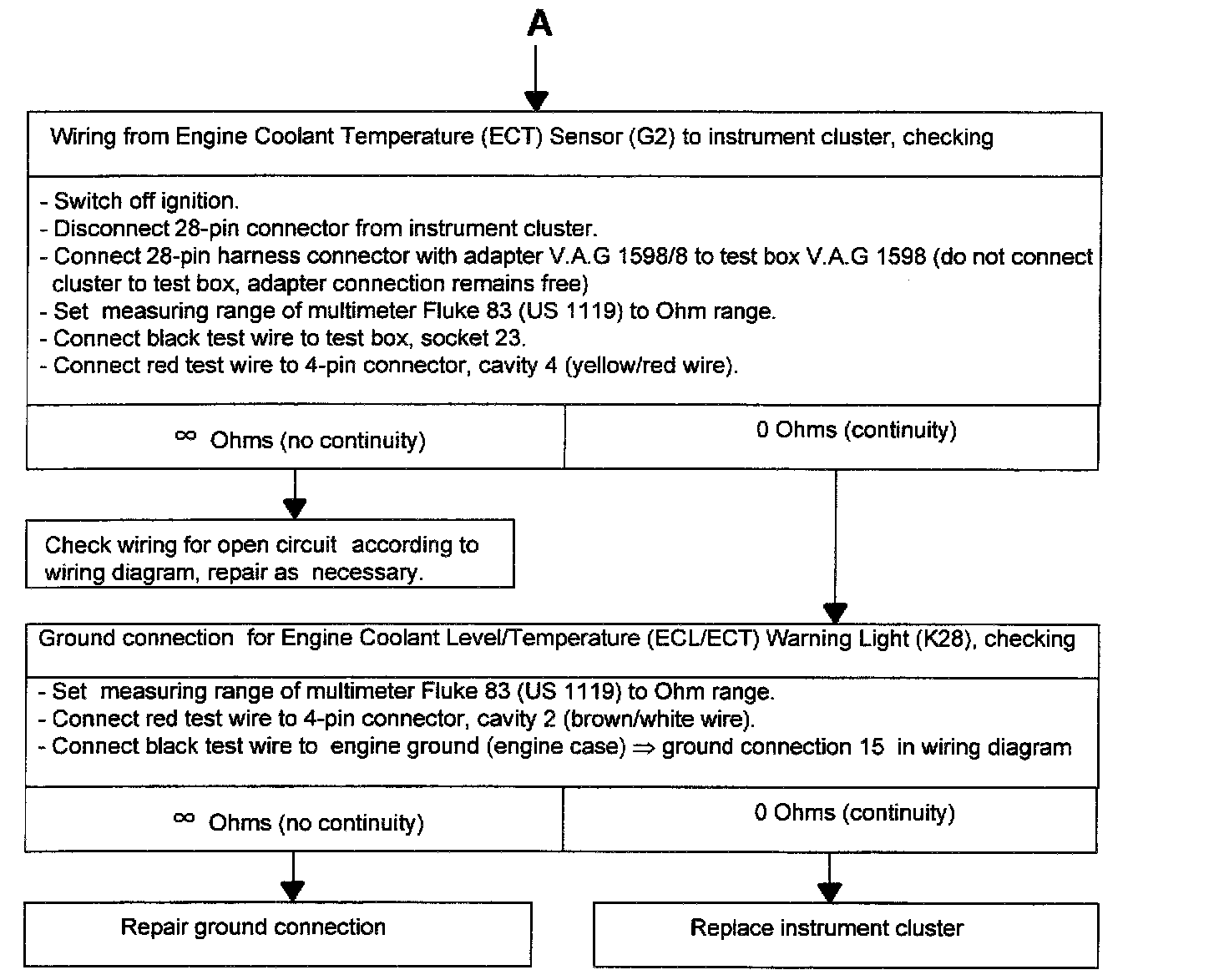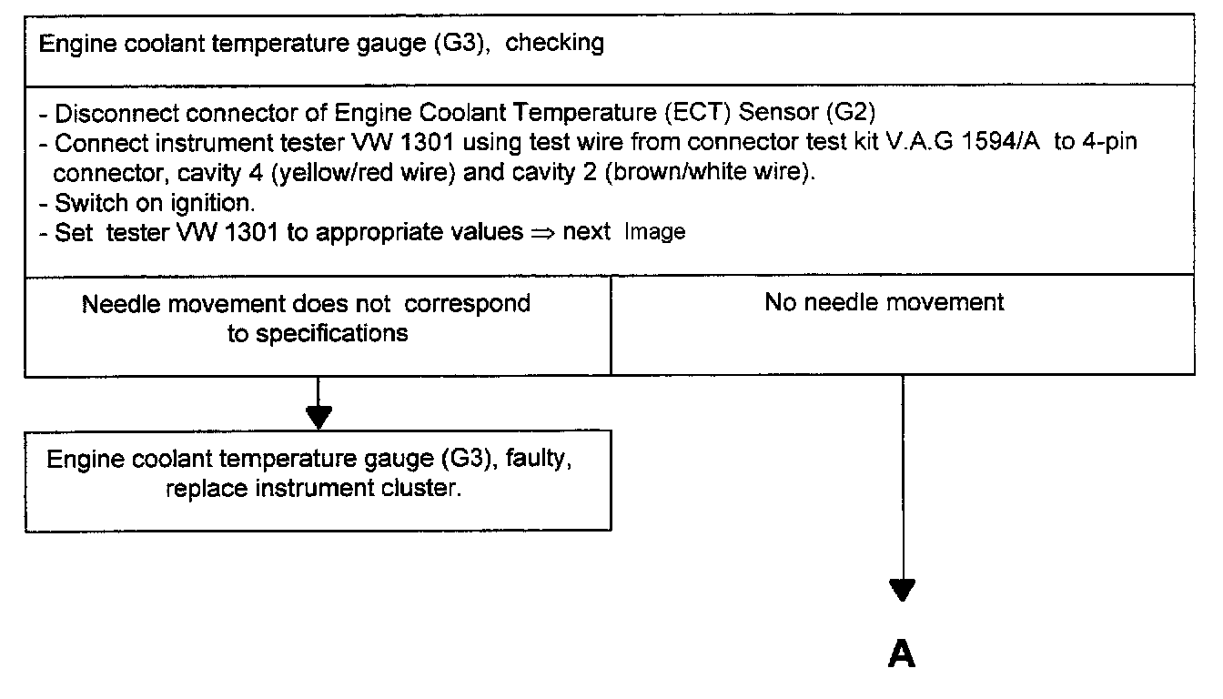 If the readings are not within specifications, the Engine Coolant Temperature (ECT) Sensor (G2) is faulty. Permissible deviation: One needle width