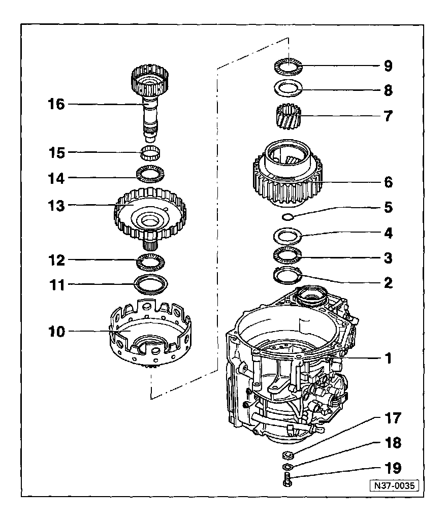 - Install all components (items -2- through -16-) to adjust planet carrier in transmission housing.