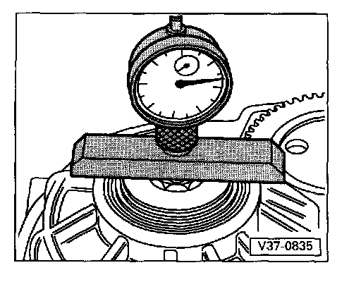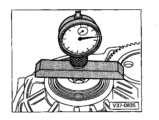 - Insert dial indicator in VW 382/7 measuring bar and place the tip on the small input shaft bolt.