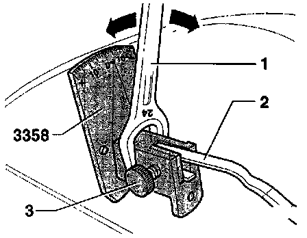- Use 24 mm open end wrench -1- on wiper arm adjusting tool 3358 and twist wiper arm -2- in direction of arrows until setting matches specification above.