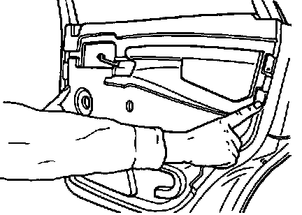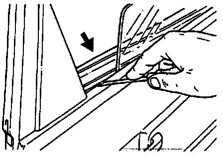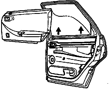 ^ Carefully pry up window rail molding (see Arrow) together with door panel and remove door panel