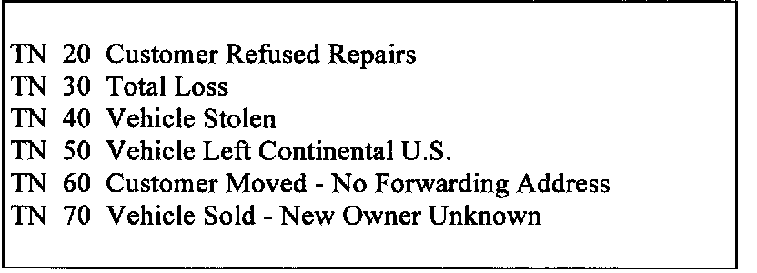 For vehicles which, according to your information are unreachable, please enter into the system one of the codes indicated below, as applicable: