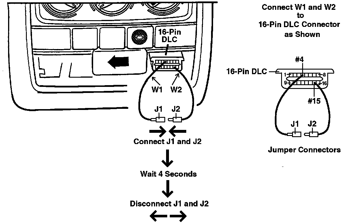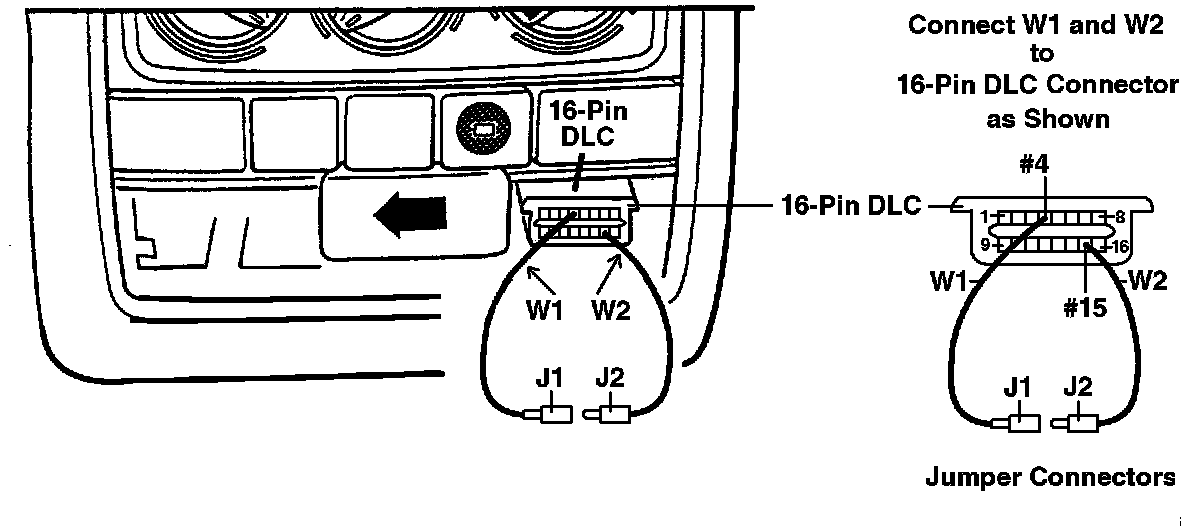 10. After approx. 4 seconds remove OBD1 adaptor from 16 Pin DLC or separate jumper wire connectors J1 and J2.