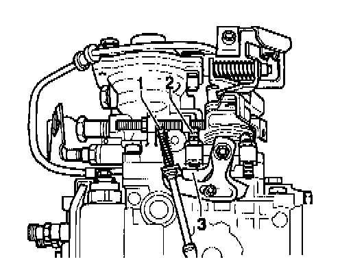 NOTE: If by turning the screw on the adjustment lever -1- the idle speed cannot be set below 930 rpm because adjustment lever -3- is against stop screw -2-, continue as follows: