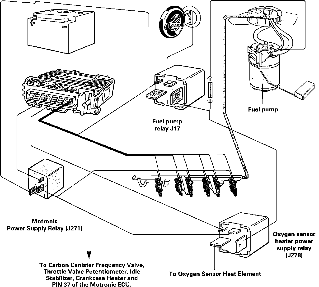 Power for the Motronic Engine Management system is supplied via fuse S18 and three relays: