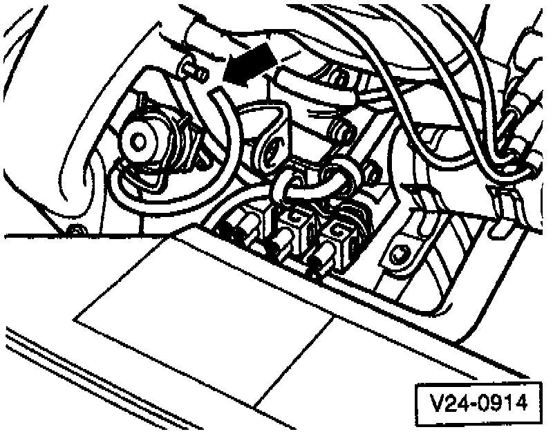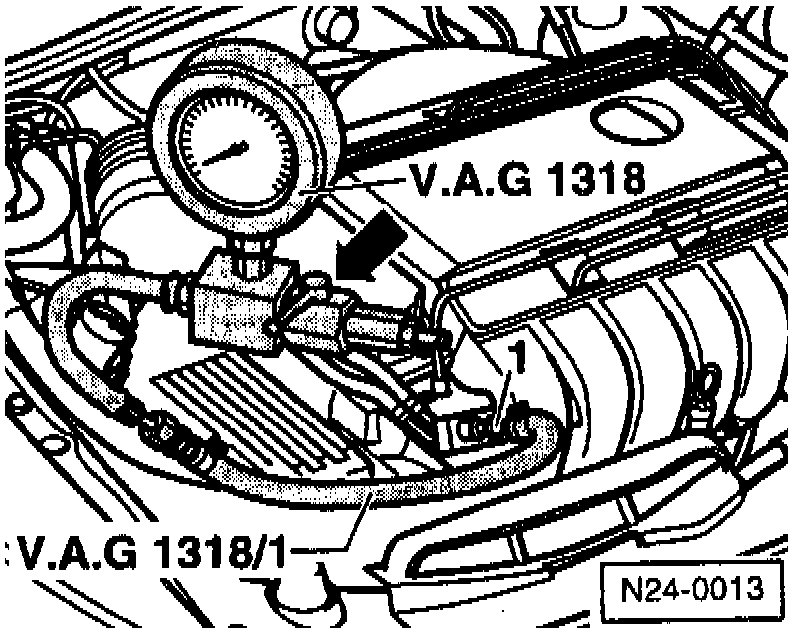 - Remove fuel rail test connection plug -1- and connect VAG 1318 pressure gauge with VAG 1318/1 adapter to fuel rail. The pressure gauge valve must be closed (lever -arrow- at right angle to direction of flow).