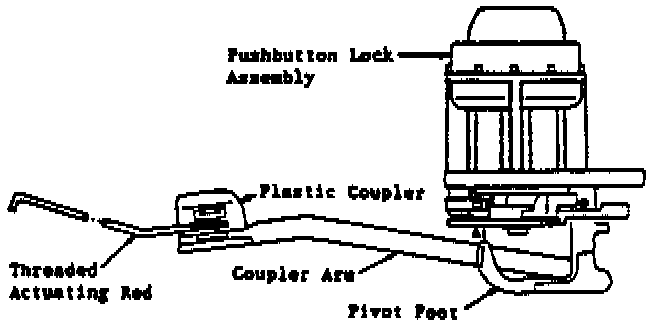 - With other hand, place threaded actuating rod into plastic coupler and pull actuating rod toward the push-button lock assembly an additional 3 to 5 mm (5 to 10 threads) before closing the coupler.