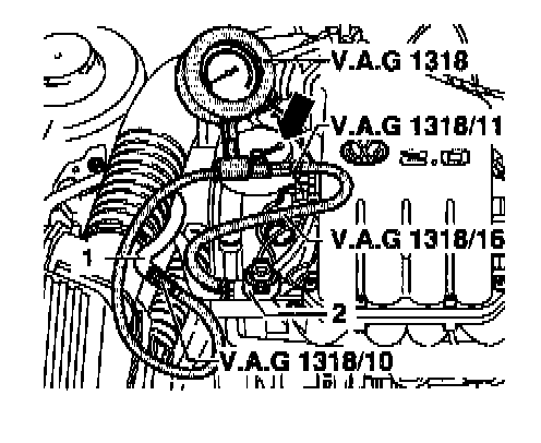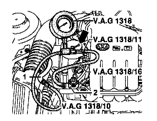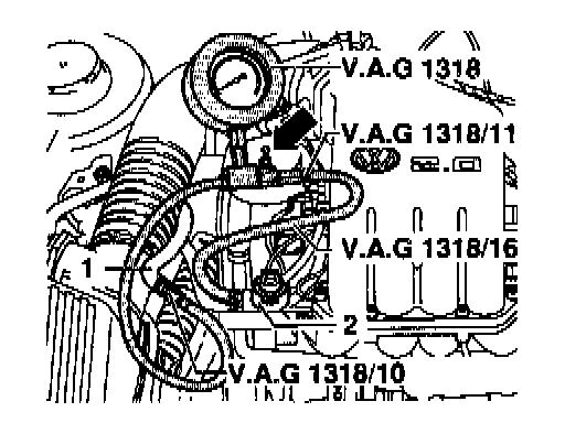 - Connect VAG 1318 pressure gauge to fuel rail -2- using VAG 1318/11 and VAG 1318/16 adapters.