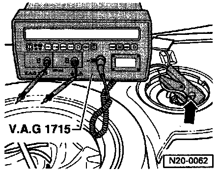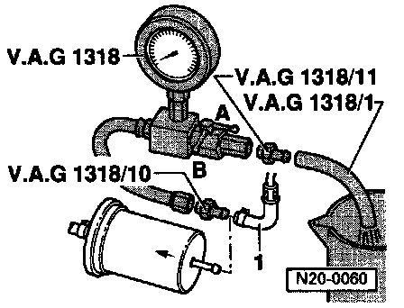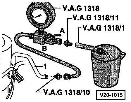 - Connect VAG 1318 pressure gauge with 1318/10 adapter to the fuel supply hose -1-.