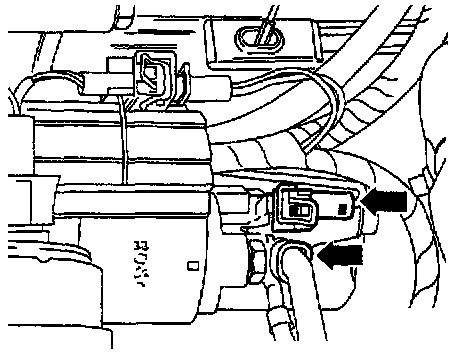 - Unlatch connector at solenoid terminal 50 -upper arrow- and disconnect.