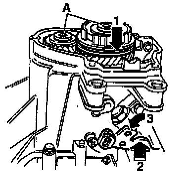 - Remove shift fork pivot pins -A- from upper side of transmission.