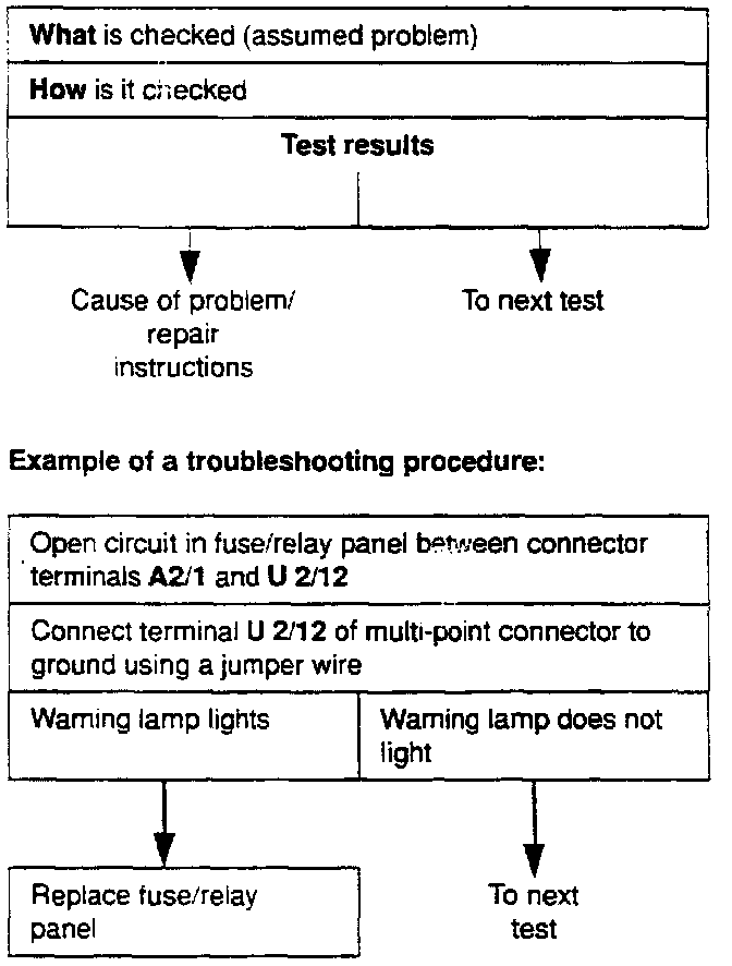 Starting with the reported problem, troubleshooting procedure show step-by-step what is checked and how it is checked in order to find the problem in the quickest and most reliable way. If several causes (of a problem) are possible in one system, a test procedure is used for diagnosis