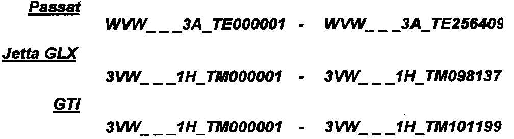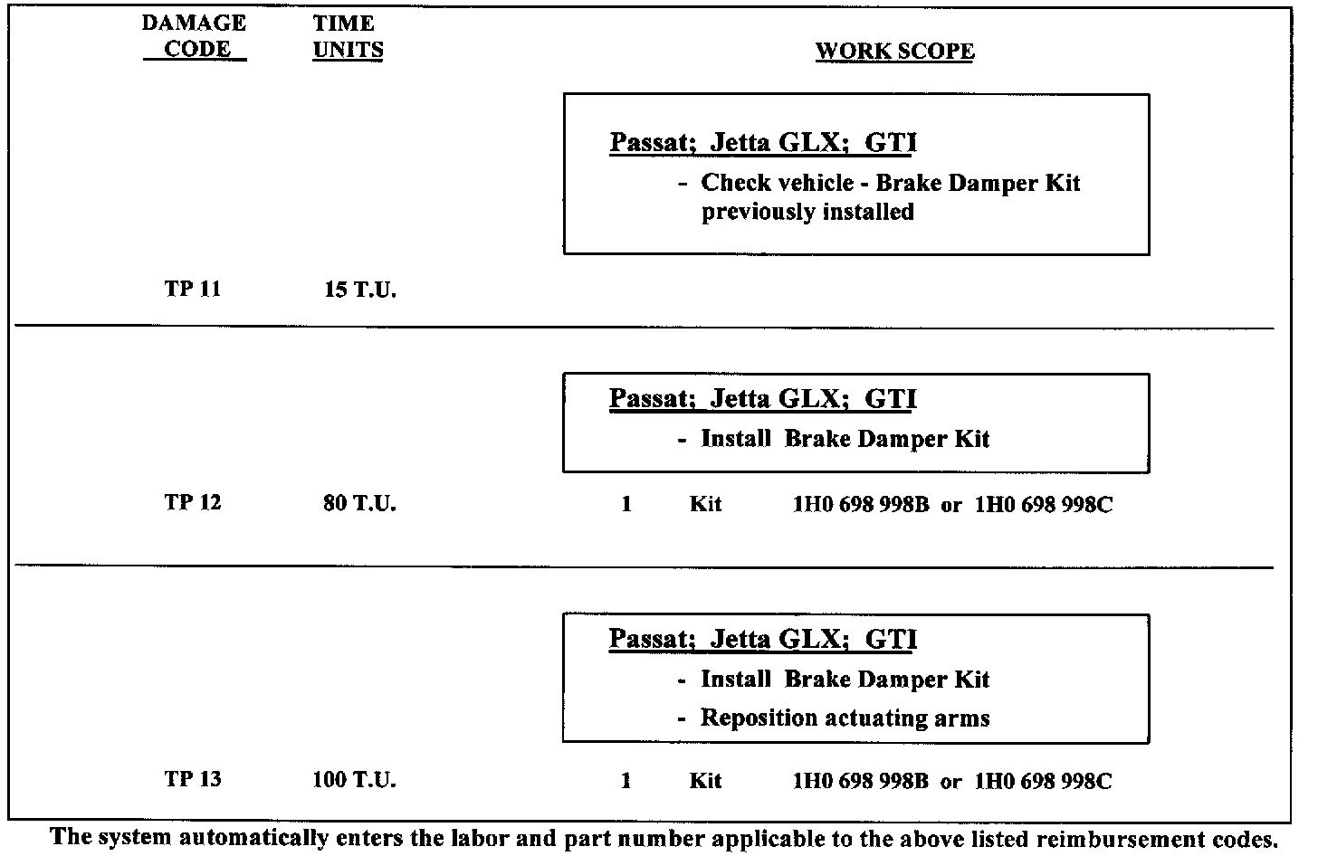 Dealers are to install a brake damper Kit, part number 1H0 698 998B or 1H0 698 998C, in vehicles within the vehicle identification number ranges listed below.