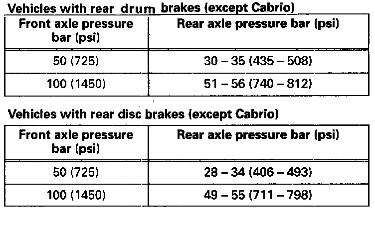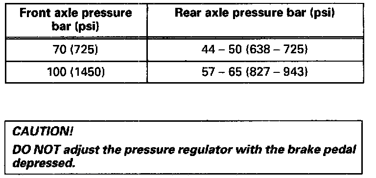4 Depress brake pedal to obtain specified pressure at front axle, then read pressure at rear axle using the tables below: